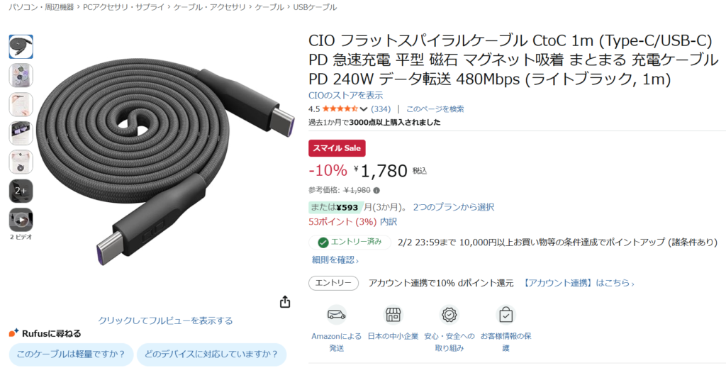 しかもしっかりPD240w高速充電にデータ転送 480Mbpsという早い転送速度も持っていて、2000なんぼで買えるもの。しかも。セール値引きは200円程度なのでいつ買ってもほぼ変わらないこれはいつ買ってもアリですね!