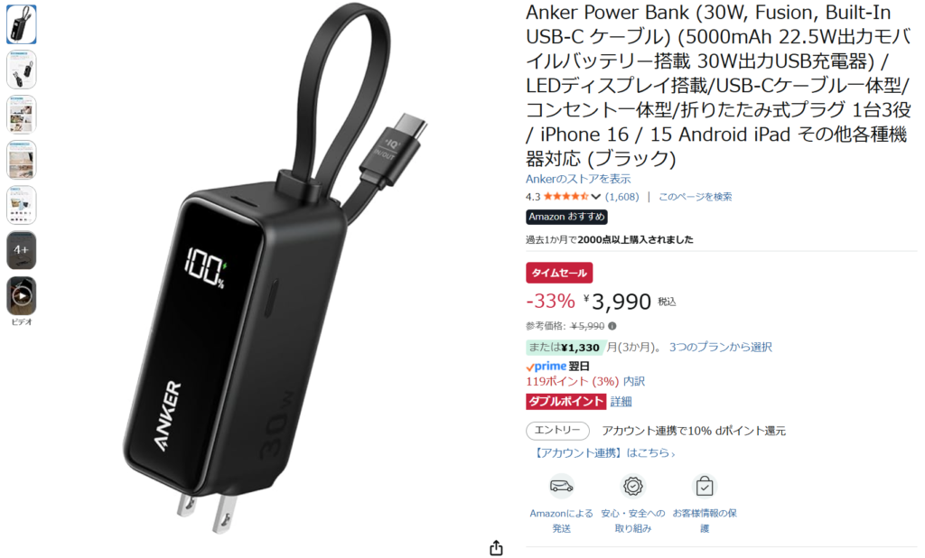 ほんと45wで推されているものかと思われますが、私としては45w急速充電があることに助かることはわかりますが、対抗馬のankerのほうが1000円以上高いし、タイムセールに関しては3990円で買えるあたりこっちのがよさげだし、大きいのほしい時こそ前述したバッテリーのがよくね。。。?とは思いますが、これめっちゃ選ばれてるので、何かいいんでしょう。うん。
