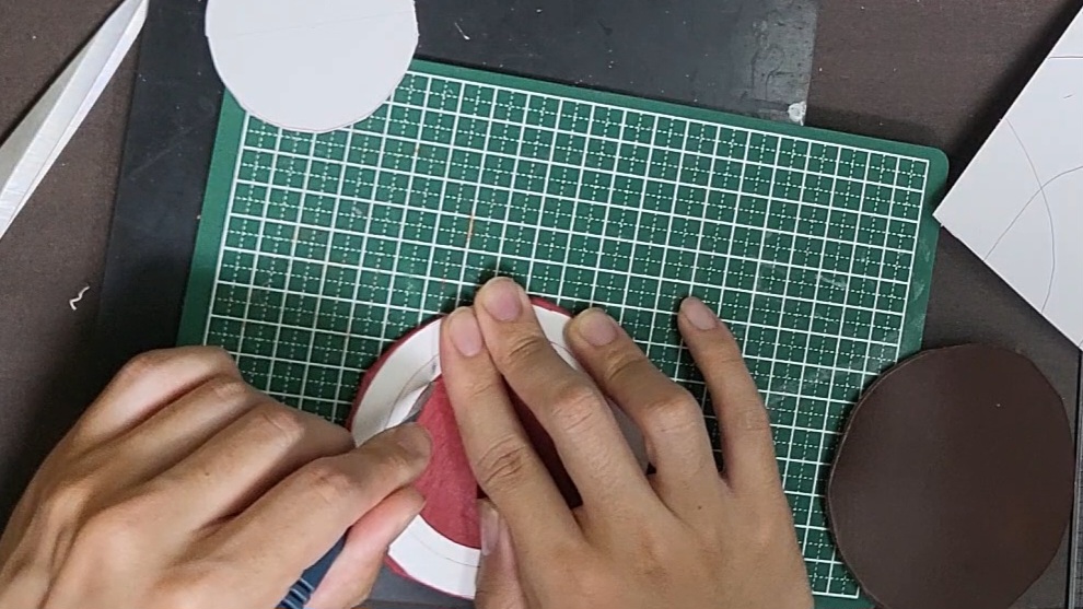 こんなかんじで細かく切ったら、ある程度の力で丸めて、ドーナツになっているなかに入れて、細かく切った革をドーナツの床面に張り付けます。