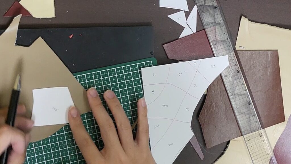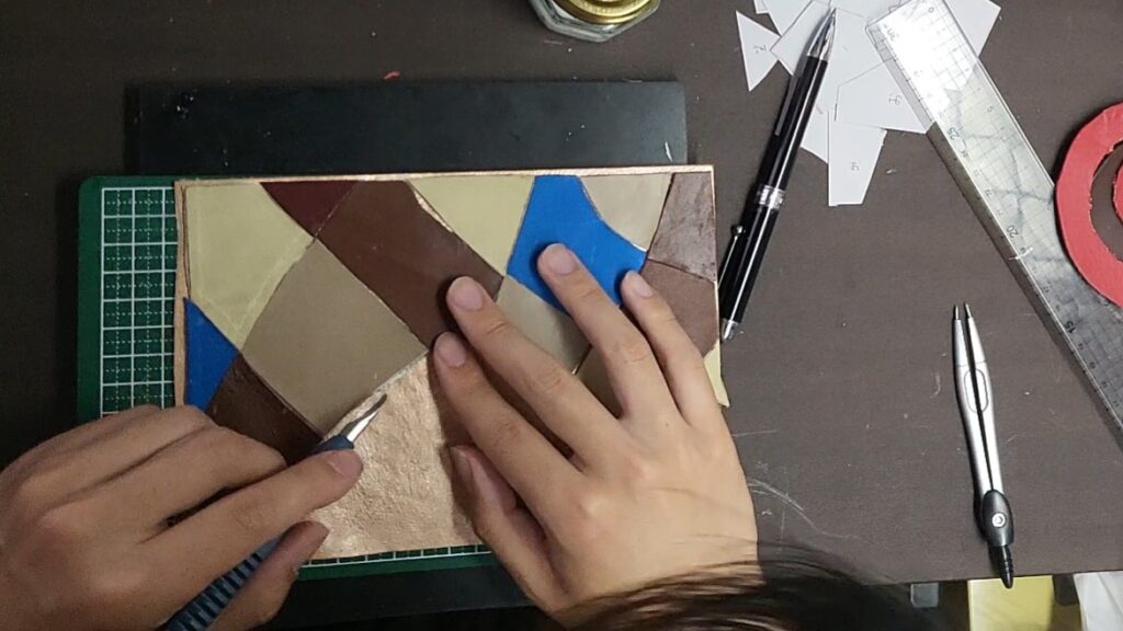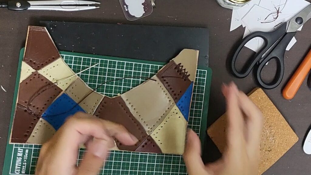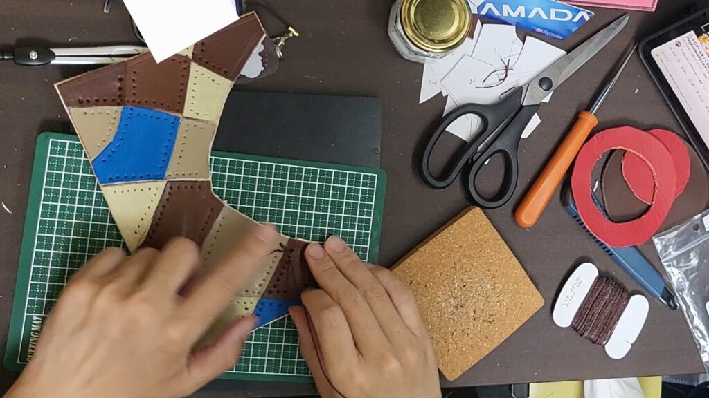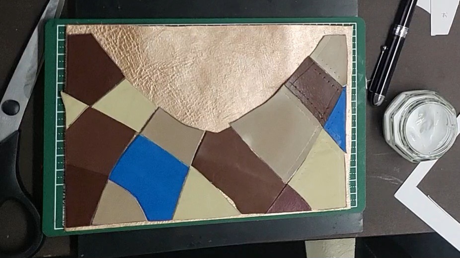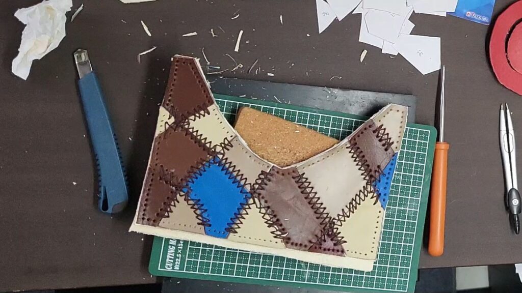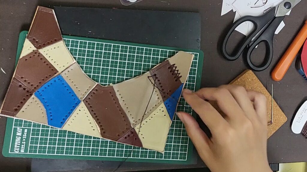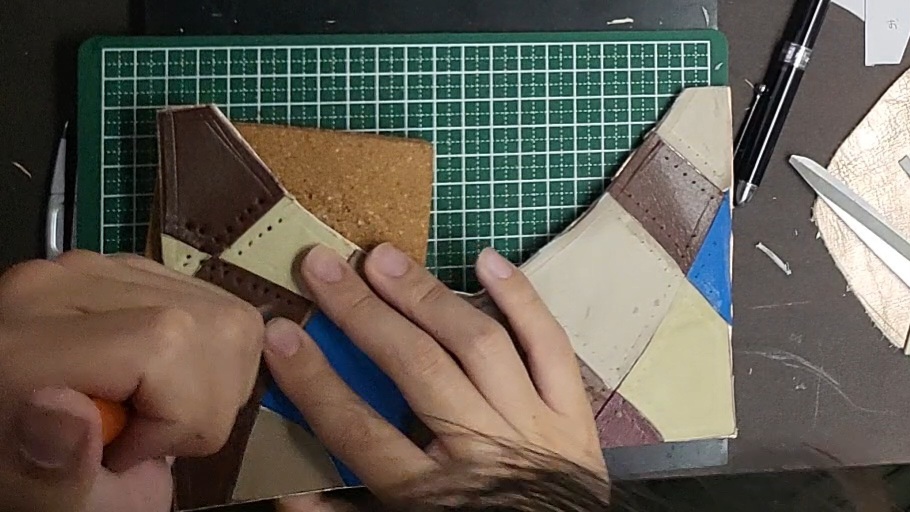 裁断した端材を張り付けて、裁縫