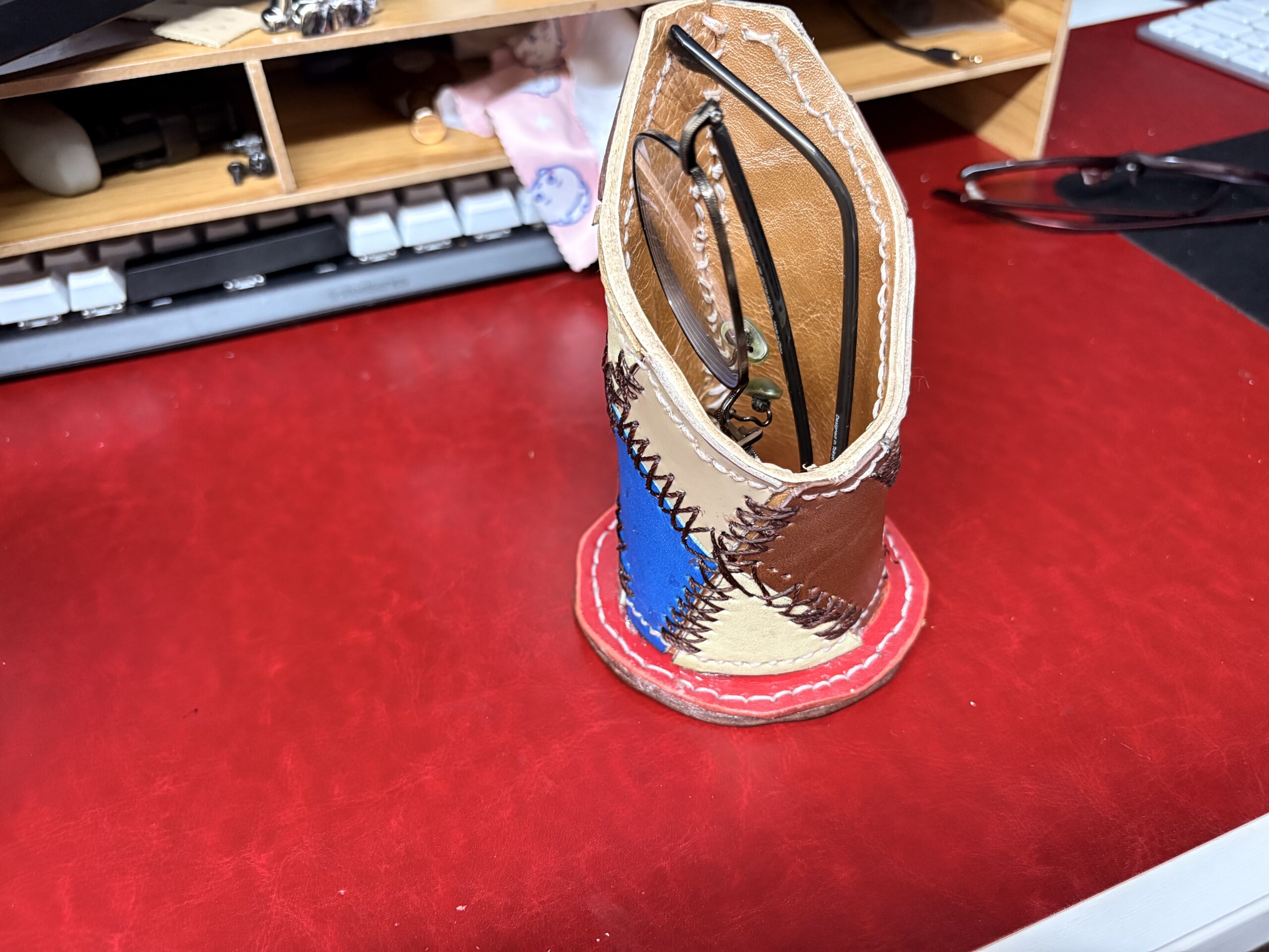 眼鏡ケース内部の銀面を張り、縫い合わせる